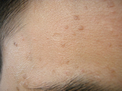 俗称“扁瘊”,好发于颜面、手背及前臂。典型皮损为米粒至黄豆大小的扁平隆起性丘疹,圆形或椭圆形,表面光滑,质硬,正常肤色或淡褐色,多骤然出现,数目较多且密集。搔抓后皮损可呈串珠状排列。